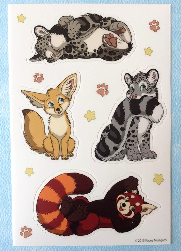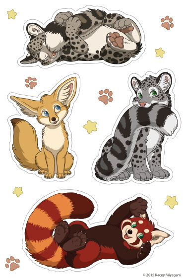 This 4"x6" vinyl sticker sheet features four cute animal stickers, two snowleopards, a red panda, and a fennec fox. The stickers are high quality, durable, and even weatherproof, so they can be used indoors or outdoors. The small pawprint and star designs are not pre-cut, but if you cut them out yourself they can also be used as stickers.