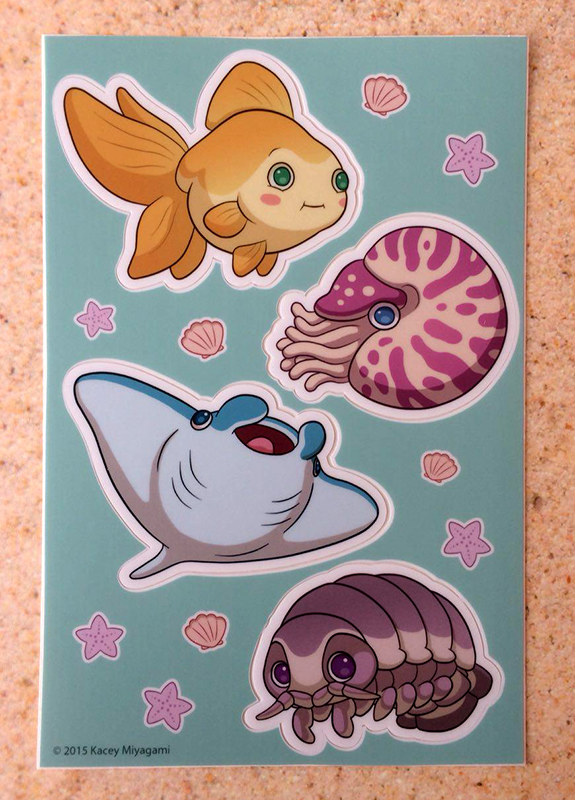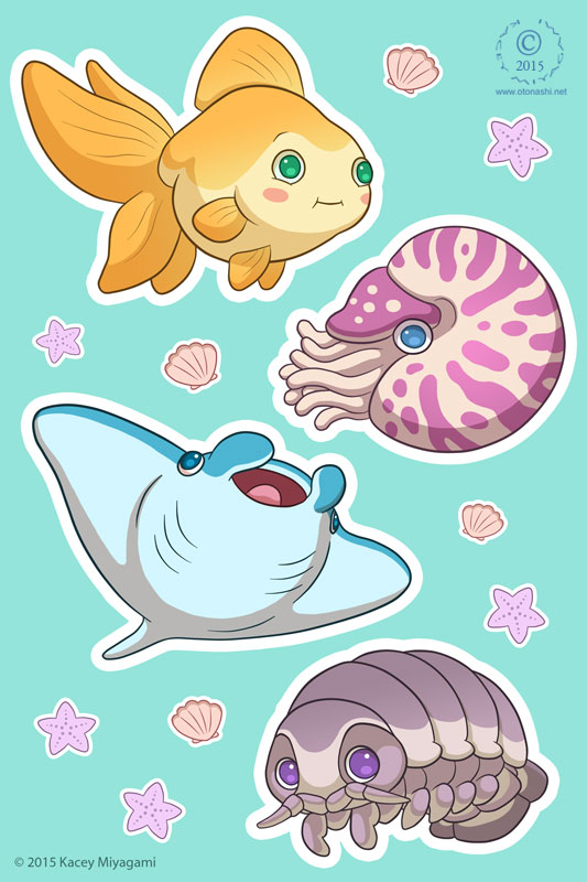 This 4"x6" vinyl sticker sheet features four cute underwater animal stickers, a goldfish, a nautilus, a manta ray, and a giant isopod. The stickers are high quality, durable, and even weatherproof, so they can be used indoors or outdoors. The small seashell and starfish designs are not pre-cut, but if you cut them out yourself they can also be used as stickers.