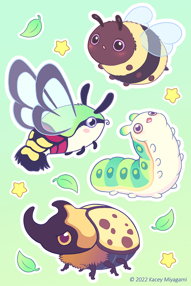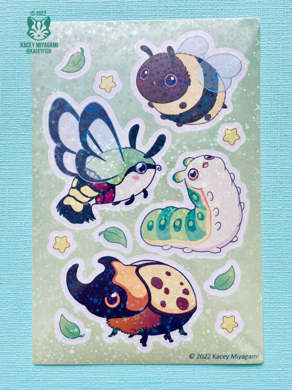 This 4"x6" vinyl sticker sheet features four cute bugs, a bumblebee, a clearwing hawkmoth, a caterpillar, and an eastern hercules beetle. The little leaves and stars are also stickers! These shiny vinyl stickers also have a very sparkly "star" finish to them, so they are very eye-catching!