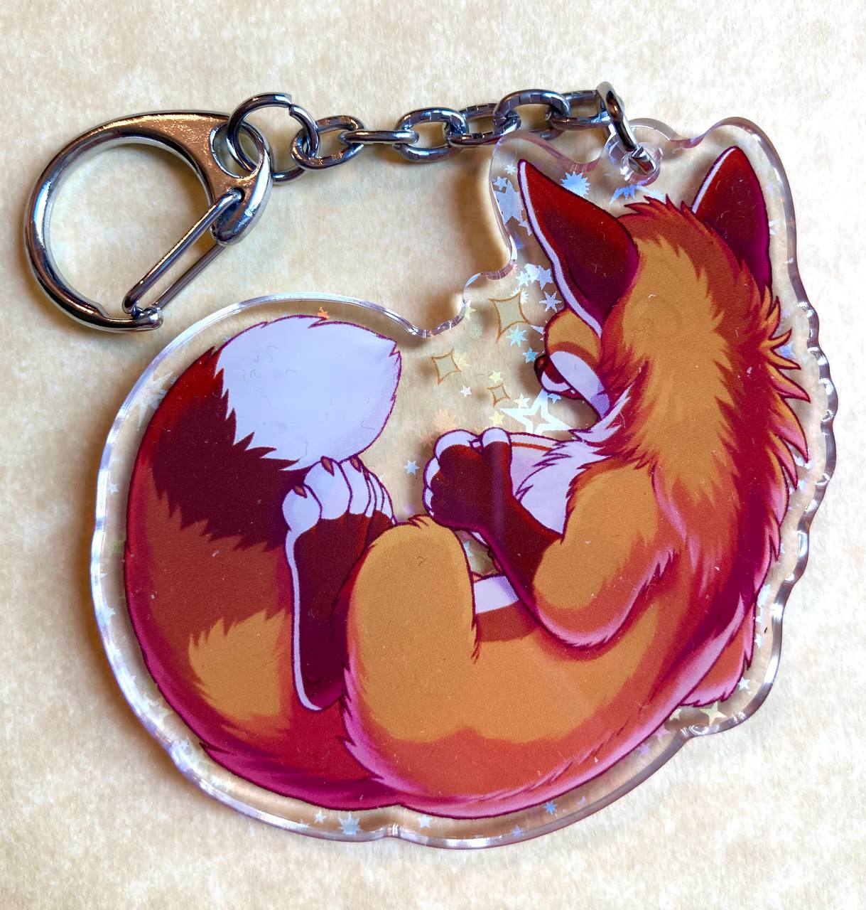 Add a little cuteness to your keys, your backpack, or anywhere else you can think to hang it! This adorable fox keychain is printed within durable 4mm clear acrylic with a holo epoxy on the front, and double sided, showing both the front and back of the critter. The charm measures approx. 2.5 inches, and hangs from a C-hook style keychain.