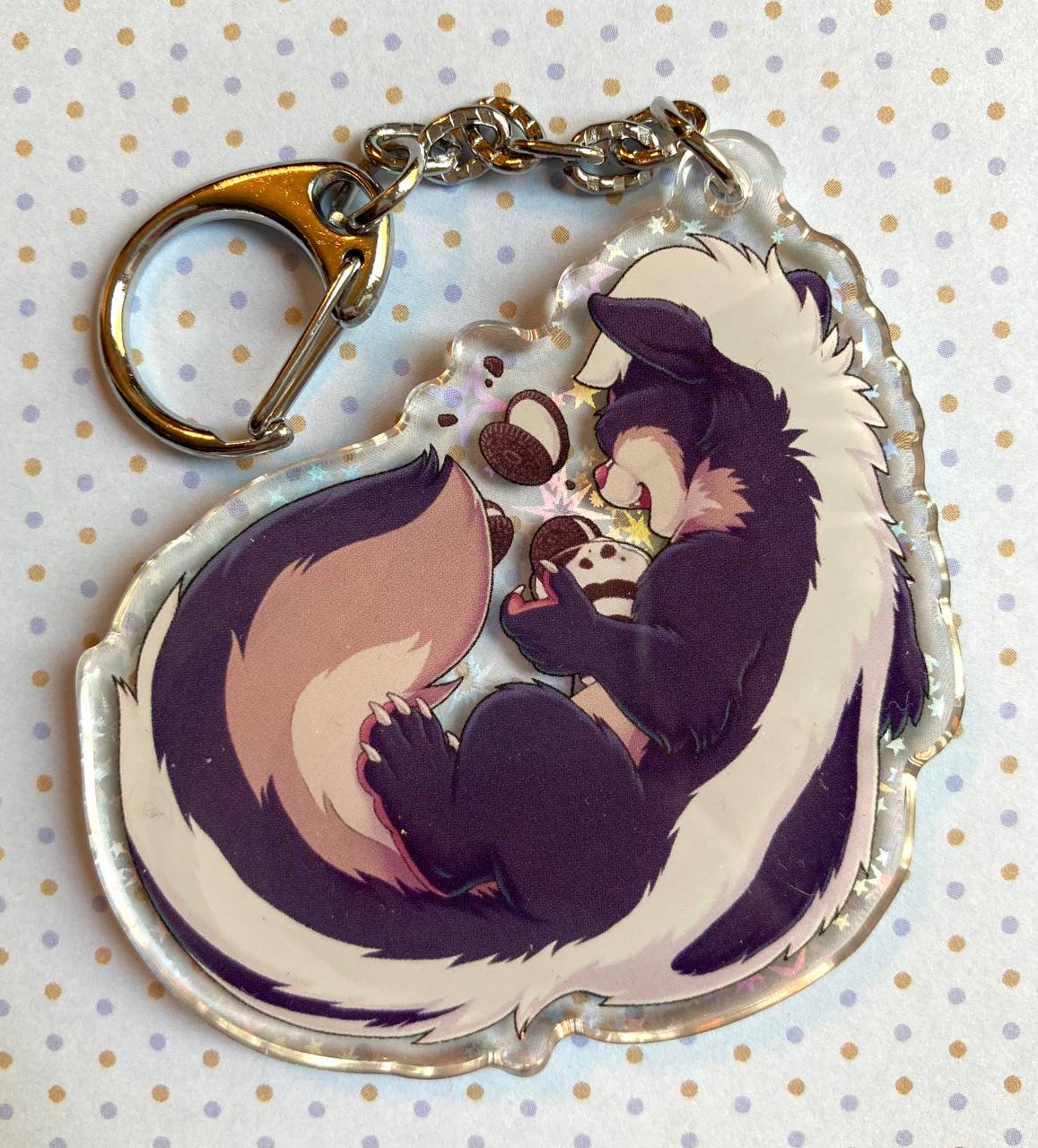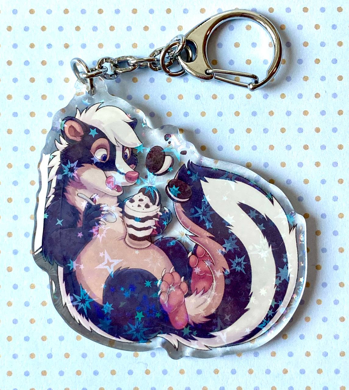 Add a little cuteness to your keys, your backpack, or anywhere else you can think to hang it! This adorable skunk keychain is printed within durable 4mm clear acrylic with a holo epoxy on the front, and double sided, showing both the front and back of the critter. The charm measures approx. 2.5 inches, and hangs from a C-hook style keychain.